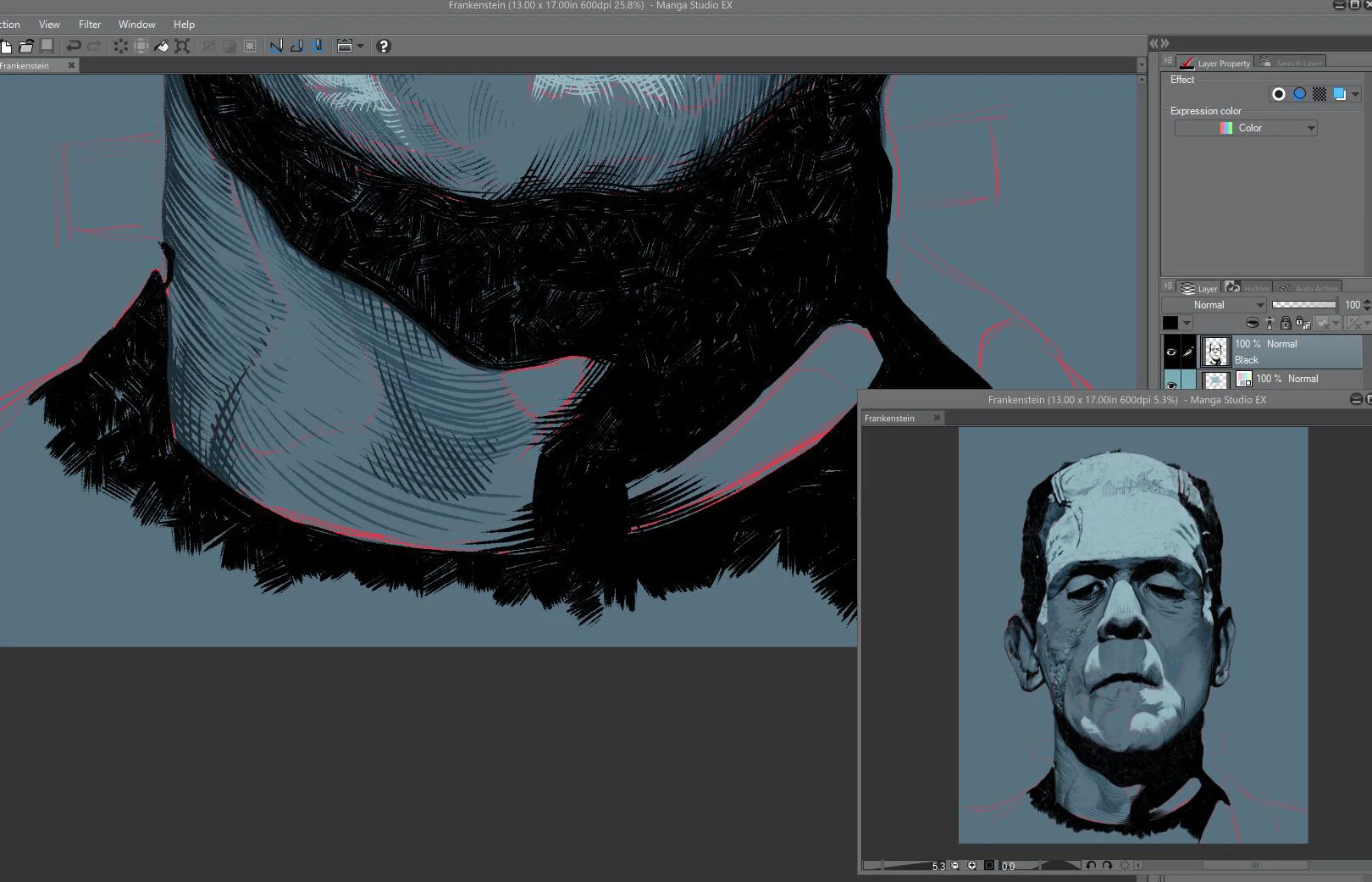 Frankenstein’s Monster is one of the most iconic creatures in all of cinematic history. And also one of the coolest designs ever! I made this piece as a sort of reductionist approach to the creature’s design, to see how few colours I could get away with. And since I seem incapable of doing single images, this was of course the first of a series that included The Bride, Dracula and the Creature of the Black Lagoon. I had plans to also do The Mummy, but that piece never went past the sketch stage. Maybe I should go back and finish it. The only thing that has stopped me from doing that is that I know myself, and I know I’ll end up redoing them all so the style and skill level remain consistent, and I’m not really sure if I’m up to that.