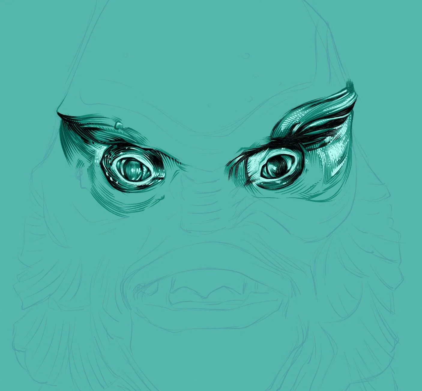 After Frankenstein’s Monster, tackling the Gill-Man was only natural. Same as before, the idea was to make a mostly mono-tone drawing, centered around a single colour, and see how many freaking lines I could stack on top of each other. Seriously, this one took a bit of time, just because it has a lot of detail in every gill, flipper, cranny and proto-auricular protection appendage. Or something.